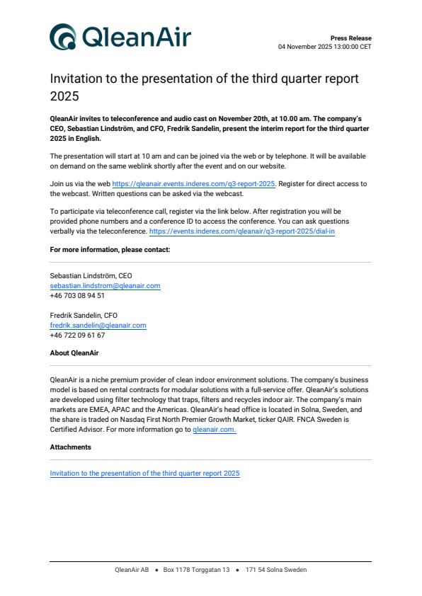 Join us via the web https://qleanair.events.inderes.com/q3-report-2025. Register for direct access to the webcast. Written questions can be asked via the webcast.