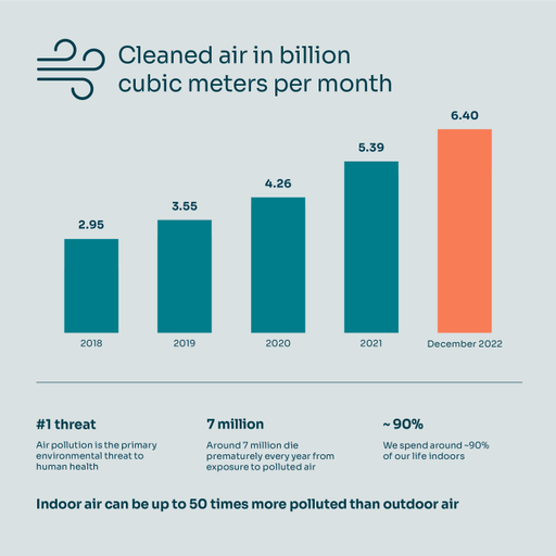 QleanAir (publ), the premium provider of indoor air cleaning solutions, increased the delivery of cleaned indoor air to 6.40 (5.39) billion cubic meters per month at the end of the fourth quarter. This means an increase of 19% compared to the fourth quarter of 2021.