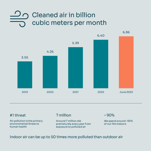 QleanAir increased the delivery of cleaned indoor air to 6.86 (5.88) billion cubic meters per month at the end of the second quarter. This means an increase of 17% compared to the second quarter of 2022.