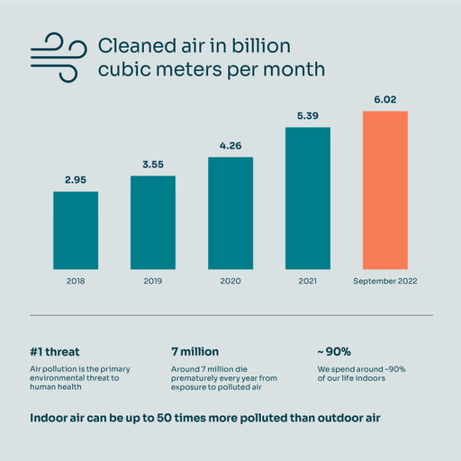 QleanAir (publ), the premium provider of indoor air cleaning solutions, increased the delivery of cleaned indoor air to 6.02 (4.89) billion cubic meters per month at the end of the third quarter. This means an increase of 23% compared to the third quarter of 2021.