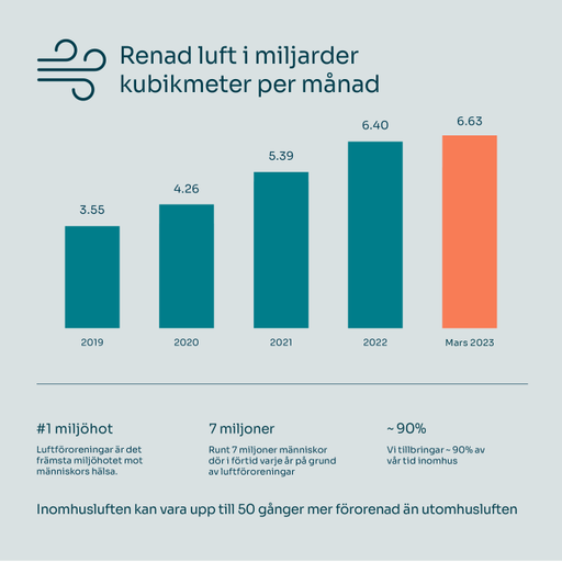 QleanAir levererade i slutet på mars 6,63 (5,66) miljarder kubikmeter renad inomhusluft per månad. Det motsvarar en ökning på 17 % jämfört med första kvartalet för föregående år. QleanAir redovisar volymen av renad inomhusluft genom sina luftrenare, renrum och rökkabiner kvartalsvis på global basis.