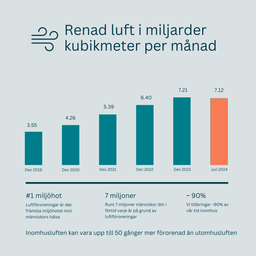 QleanAir ökade leveransen av renad inomhusluft till 7,12 (6,86) miljarder kubikmeter per månad vid utgången av andra kvartalet. Det innebär en ökning på 4% jämfört med slutet av andra kvartalet 2023.