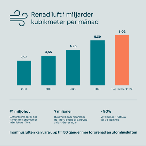 QleanAir levererade i slutet på september 6,02 (4,89) miljarder kubikmeter renad inomhusluft per månad. Det motsvarar en ökning på 23% jämfört med tredje kvartalet för föregående år. QleanAir redovisar volymen av renad inomhusluft genom sina luftrenare, renrum och Cabin Solutions kvartalsvis på global basis.