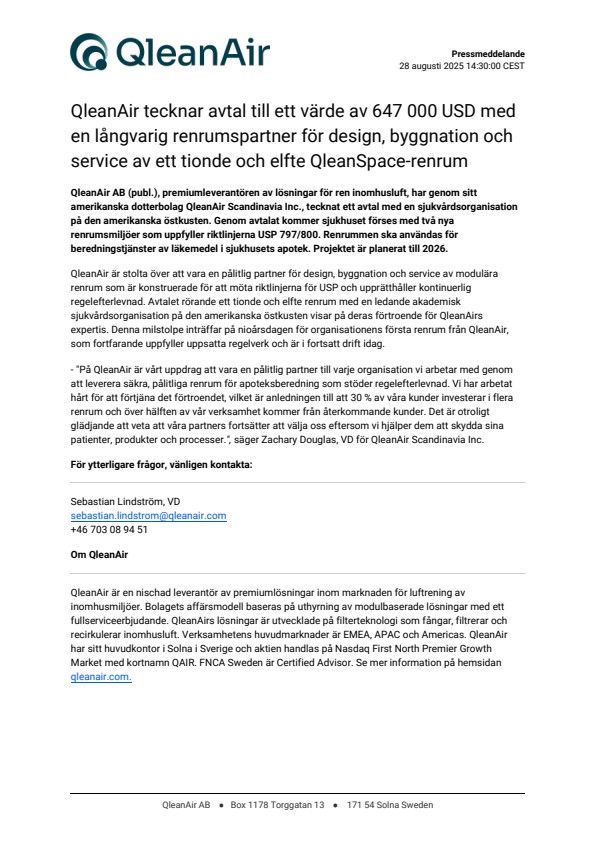 QleanAir AB (publ.), premiumleverantören av lösningar för ren inomhusluft, har genom sitt amerikanska dotterbolag QleanAir Scandinavia Inc., tecknat ett avtal med en sjukvårdsorganisation på den amerikanska östkusten. Genom avtalat kommer sjukhuset förses med två nya renrumsmiljöer som uppfyller riktlinjerna USP 797/800. Renrummen ska användas för beredningstjänster av läkemedel i sjukhusets apotek. Projektet är planerat till 2026.