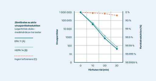 Studien genomfördes i en säker testkammare. Aktivt virus spreds med en aerosolgenerator och fångades in med hjälp av den mobila luftrenaren QleanAir FS 30 utrustad med två olika huvudfilter, HEPA 14 och EPA 11. Det tog bara 10 minuter att ta bort över 95 % av viruspartiklarna från luften med luftrenaren. Utan luftrenare var partikelreduktionen endast 16,9 %. Efter 20 minuter eliminerades cirka 99,9 % och efter 30 minuter över 99,99 %. FS 30 utrustad med EPA 11-filtret nådde 99,9 % och 99,99 % partikelreduktion något snabbare på grund av dess högre luftflöde.